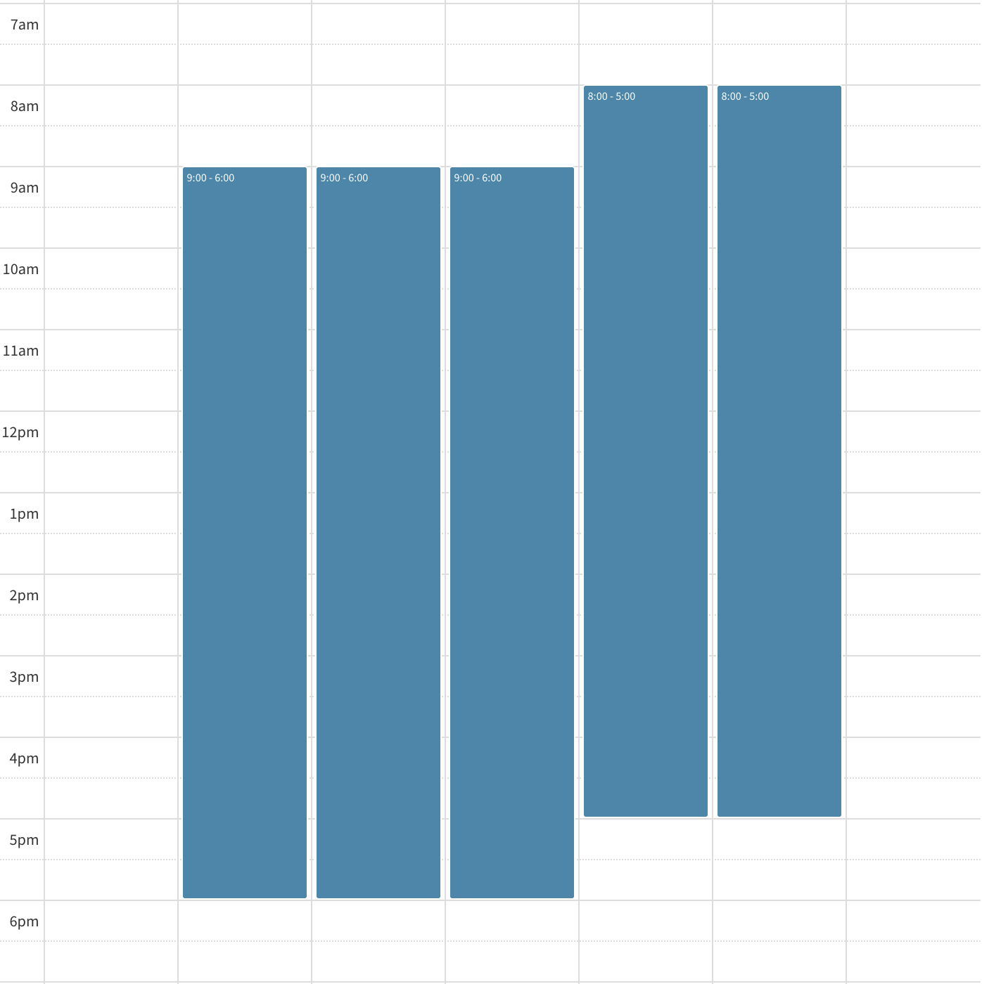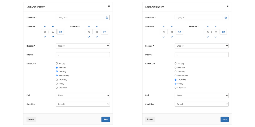 The example below shows one shift pattern which runs from Monday - Wednesday, 9am - 6pm. And another which runs Thursday - Friday, 8am - 5pm.